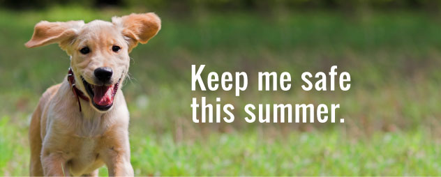 The warm summer months are the perfect time to take your dog with you for outdoor, family fun. But with the rising temperatures, dogs can easily get overheated in the summer, causing them to become dehydrated and sick. Not only is it important to keep dogs safe in hot weather, it’s also important to keep them clear from hazardous chemicals and certain foods.