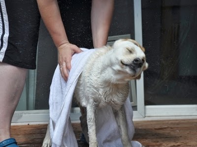 Get a small or big towel, lay it over your dog’s back, and rub your dog dry. Make sure you dry the inside of his ears also. A dog’s instinct is to shake itself when wet, though, so be careful. In the winter, or for small dogs almost all the time, lay a dry towel on the floor and use a hair dryer and dog brush to dry and brush your dog.