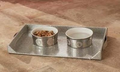 This feeding platter will have your pet eating in style. Washable silver glitter PU fabric. Keep feeding areas neat and organized.