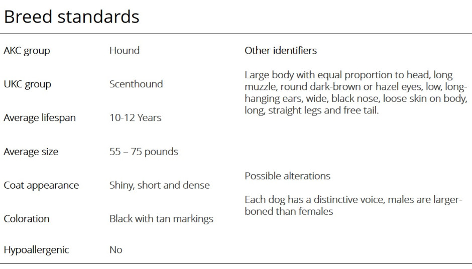 The American Kennel Club recognized the breed in 1945. The first Black and Tan Coonhound registered by the AKC was Grand Mere Big Rock Molly.