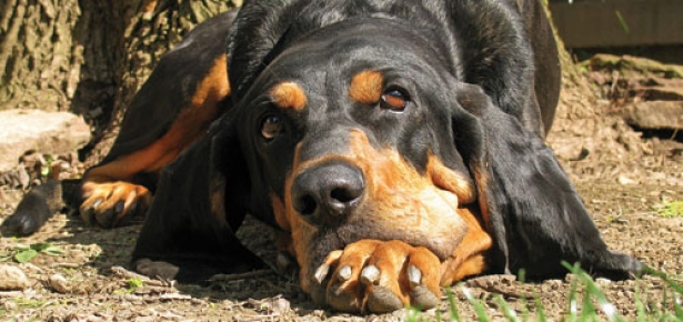 This breed has a black coat with tan points above the eyes, on the sides of the muzzle, and on the chest, legs and breeching (the upper thigh area), plus black pencil markings on the toes.