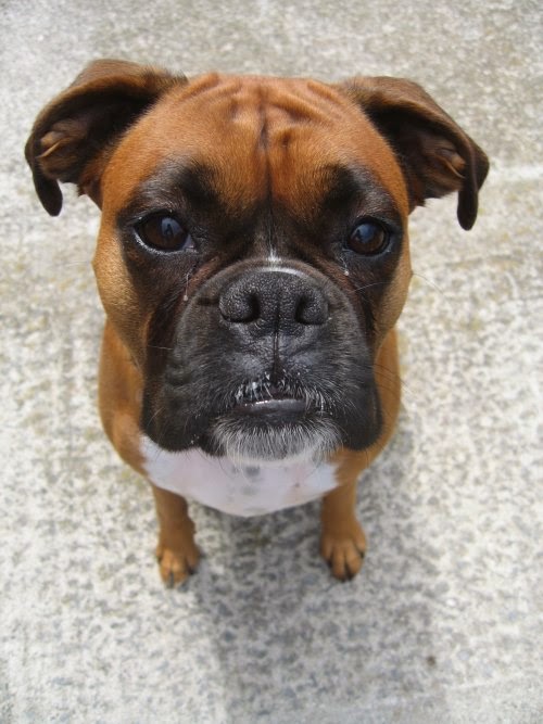 The Boxer is a breed of stocky, medium-sized, short-haired dogs developed in Germany. Their coat is smooth and tight-fitting; colors are fawn or brindled, with or without white markings, which may cover the entire body, and white. Boxers are brachycephalic (they have broad, short skulls), have a square muzzle, mandibular prognathism (an underbite), very strong jaws, and a powerful bite ideal for hanging on to large prey. The Boxer was bred from the Old English Bulldog and the now extinct Bullenbeisser, and is part of the Molosser group. The Boxer is a member of the Working Group. Boxers were first exhibited in a dog show for St. Bernards in Munich in 1895, the first Boxer club being founded the next year. Based on 2013 American Kennel Club statistics, Boxers held steady as the seventh most popular breed of dog in the United States for the fourth consecutive year. Highlights