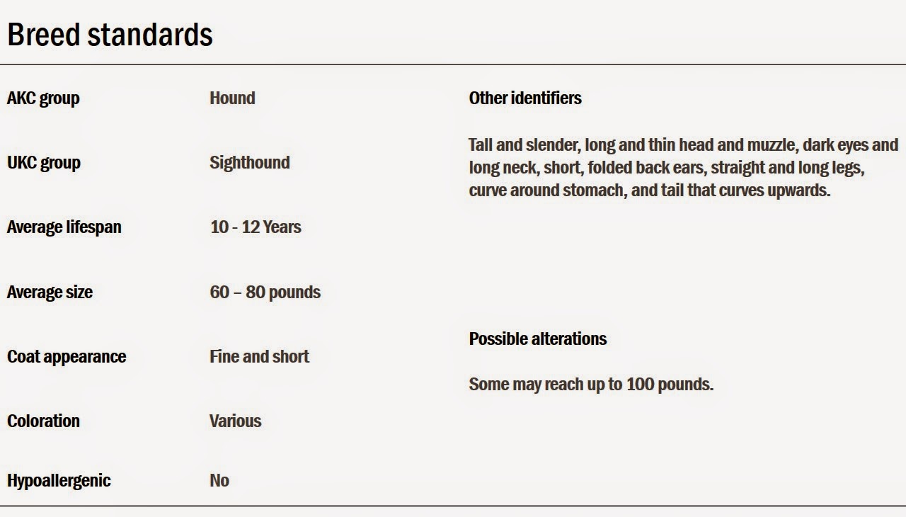 Prone to bloat, the Greyhound does best with breakfast, lunch and dinner. Lazily waking up in the morning to a rubdown, he’ll enjoy sticking to his routine of a morning walk before his owner leaves for work. Enjoying having the house to himself, he’ll lazily keep an eye on everything while you’re away. Greeting you when you come in the door, he’ll be ready for a run and perhaps a bit of racing before the day is over. Just make sure to keep him on the leash in case he spots a rabbit and feels the need to chase it down.