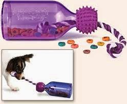 Stuff dry food into the sides of the barbell-shaped Waggle and the bits will fall out intermittently as your dog holds the middle part in his mouth and shakes it. Well, that’s supposed to be how it works, at least–my dog prefers to just kind of roll it around with his paws until the treats come out. That works too. There are rubber teeth in the holes on the sides that can be snipped out in order to reduce the level of difficulty. Premier also makes the Chuckle, which is similar but a little sturdier and has a squeaker inside.