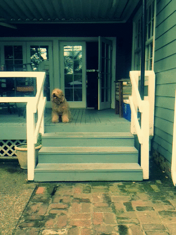 He watches over my safety in the bathroom. He has taught me not to close the door tightly or he’ll throw his body against it and begin frantically scratching. He knows he can’t save me if I’m not in his line of vision. My hero has made it clear to leave the door open a crack. That way he can use his nose to push the door all the way open, smile at me, and wag his tail like a metronome on speed.